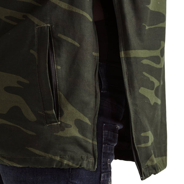 Introducing the GUNNER camouflaged oversized pullover hooded jacket with a concealed front pocket. This jacket is constructed from high quality 100% cotton canvas customised with a camo print. The hooded jacket has a light taffeta lining with extra wadding for protection against the elements. Finer details include a half zip, a grown on hood with a drawstring and S.P.C.C branded PU branded labels on the sleeve and hem.